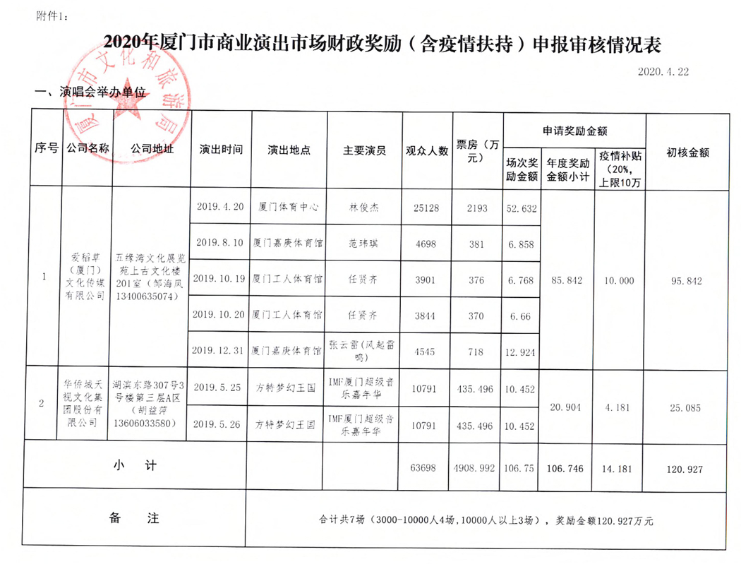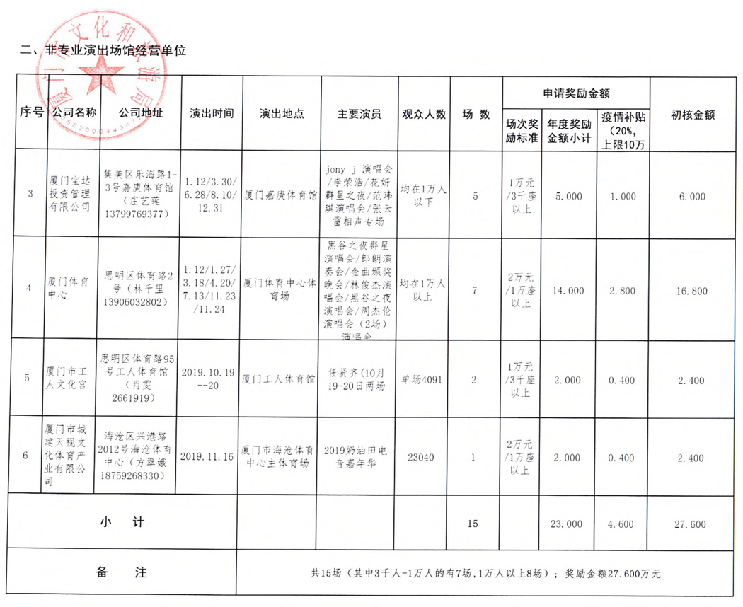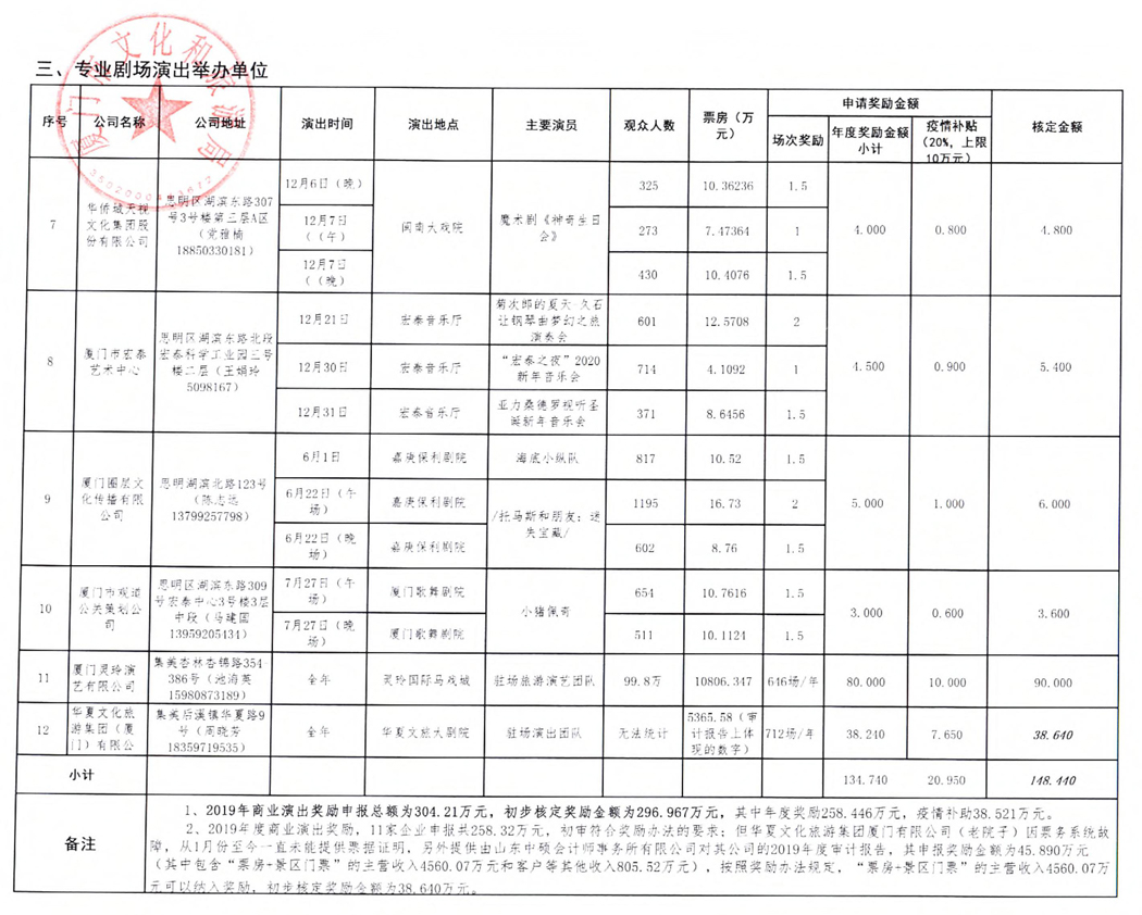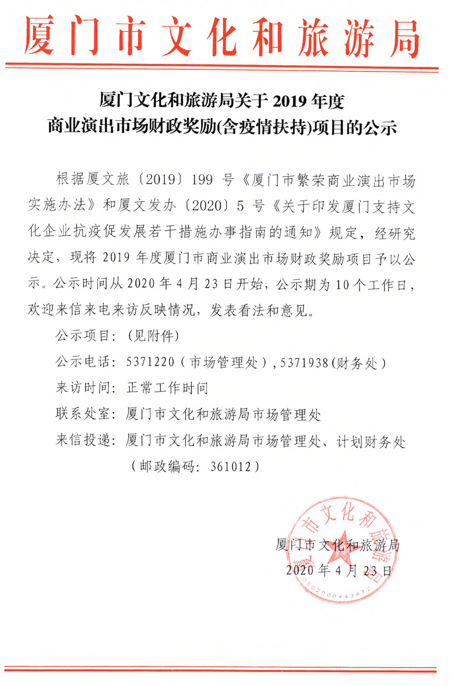 廈門(mén)文(wén)化(huà)和(hé)旅遊¥ §局關于2019年(nián)度商業(yè)演出市(shì)場(chǎng)财政獎勵(含✘•疫情扶持)項目的(de)公示